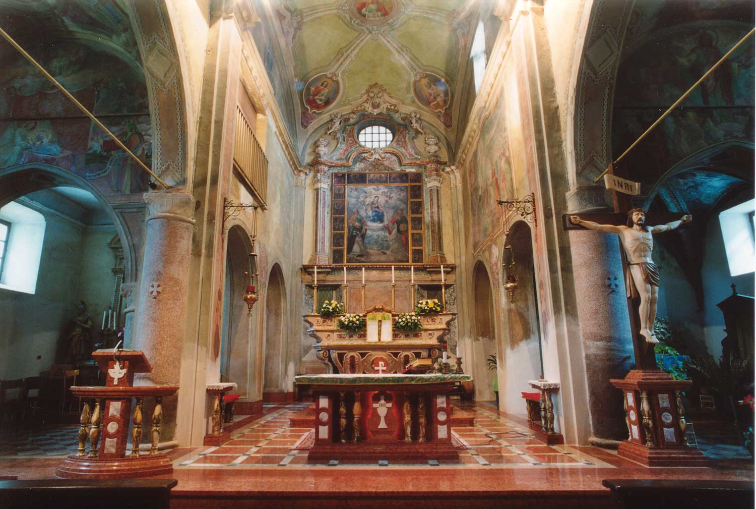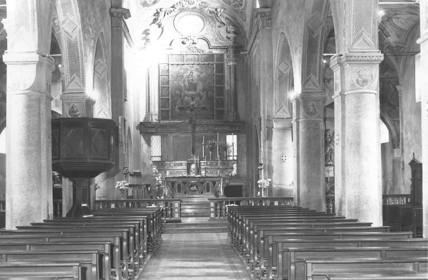Resta da pensare alla tinteggiatura delle porzioni di pareti e volte non occupate da dipinti: gli attuali ornati a fogliame che corrono sugli archi, i già citati chiaroscuri di Santi sulle facce dei capitelli, gli ornati di varie forme sulle volte, sulle lesene e sulle colonne, come pure gli affreschi di pessimo gusto (parole di don Bernardino) che si trovano in capo alle due navate laterali e nel presbiterio sono opera del decoratore Gilardi e risalgono al 1944.